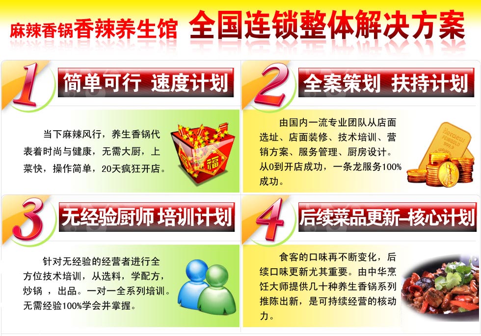 總部傳授全套秘制底料、秘制紅油、秘制醬料、中草藥香辛料、百年老湯核心配方及全套制作方法。 1.統(tǒng)一贈(zèng)送:授權(quán)銅牌,授權(quán)書,開店資格證書,選址評(píng)估、技術(shù)培訓(xùn)、整體形象設(shè)計(jì)、店面設(shè)計(jì)、開業(yè)指導(dǎo)、市場督導(dǎo)、個(gè)性化跟蹤服務(wù)、定期升級(jí)服務(wù)。 2.培訓(xùn)內(nèi)容:麻辣香鍋極品鍋、麻辣香鍋精品鍋、麻辣香鍋?zhàn)萄a(bǔ)鍋、麻辣香鍋山珍菌鍋麻辣香鍋鴛鴦鍋