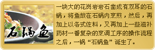 | “石鍋魚”是一道名菜,制作方法很是獨特,用一塊大的花崗巖巖石鑿成有雙耳的石鍋,將魚放在石鍋內(nèi)烹煎,然后,再加上以辣椒為主的各式佐料,又再加上一些滋補藥材,這樣,經(jīng)過一番復雜的烹調(diào)工序的操作流程之后,一鍋“石鍋魚”誕生了。當用石鍋烹制的“石鍋魚”端上桌來時,一定會令你垂涎三尺。